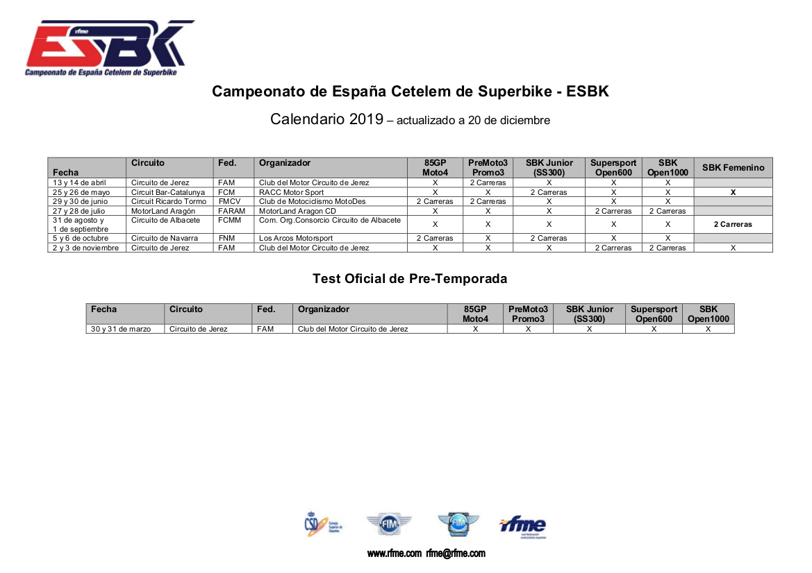 Calendario Campeonato de España Cetelem de Superbike 2019.
