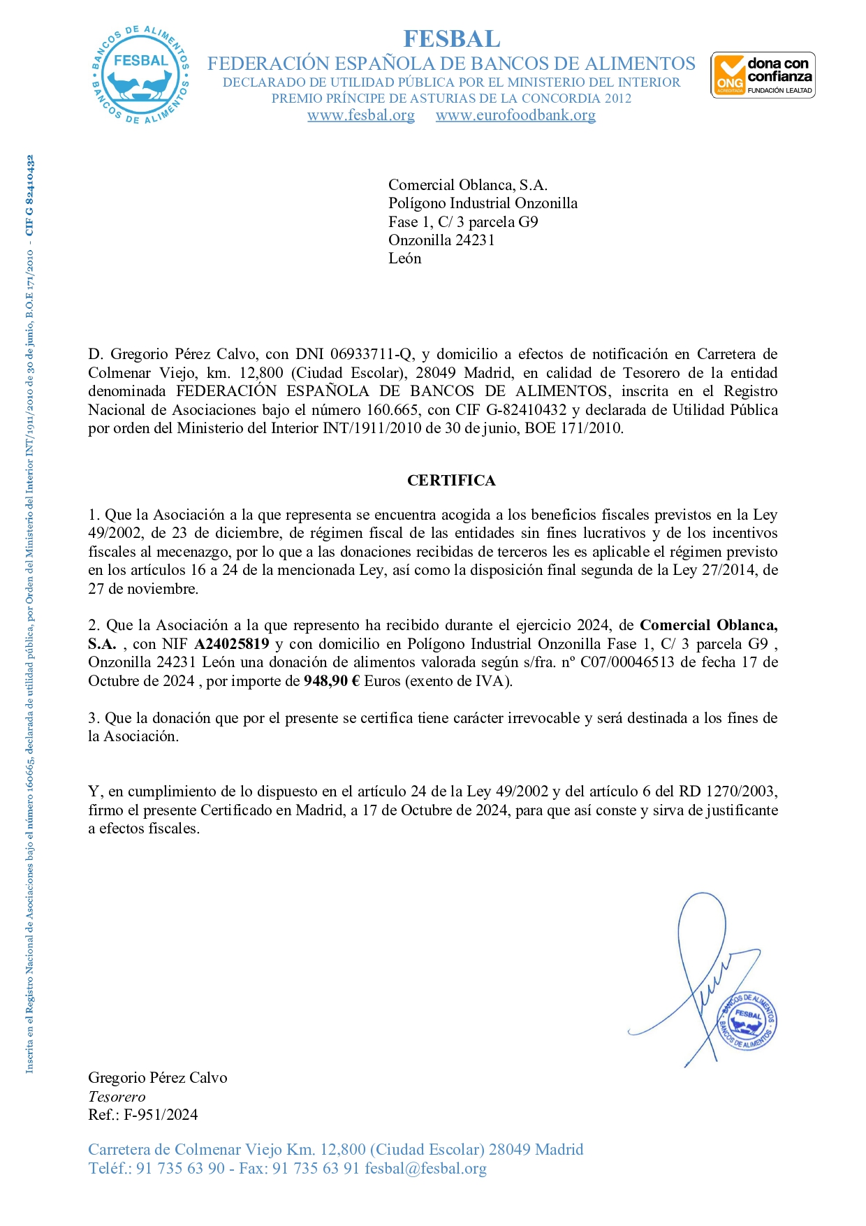 Grupo Oblanca vuelve a colaborar con el Banco de Alimentos de León, institución de referencia en la capital leonesa en la lucha contra el hambre y el apoyo a la población más desfavorecida, con una nueva donación que incluye artículos de alimentación de nuestro surtido.