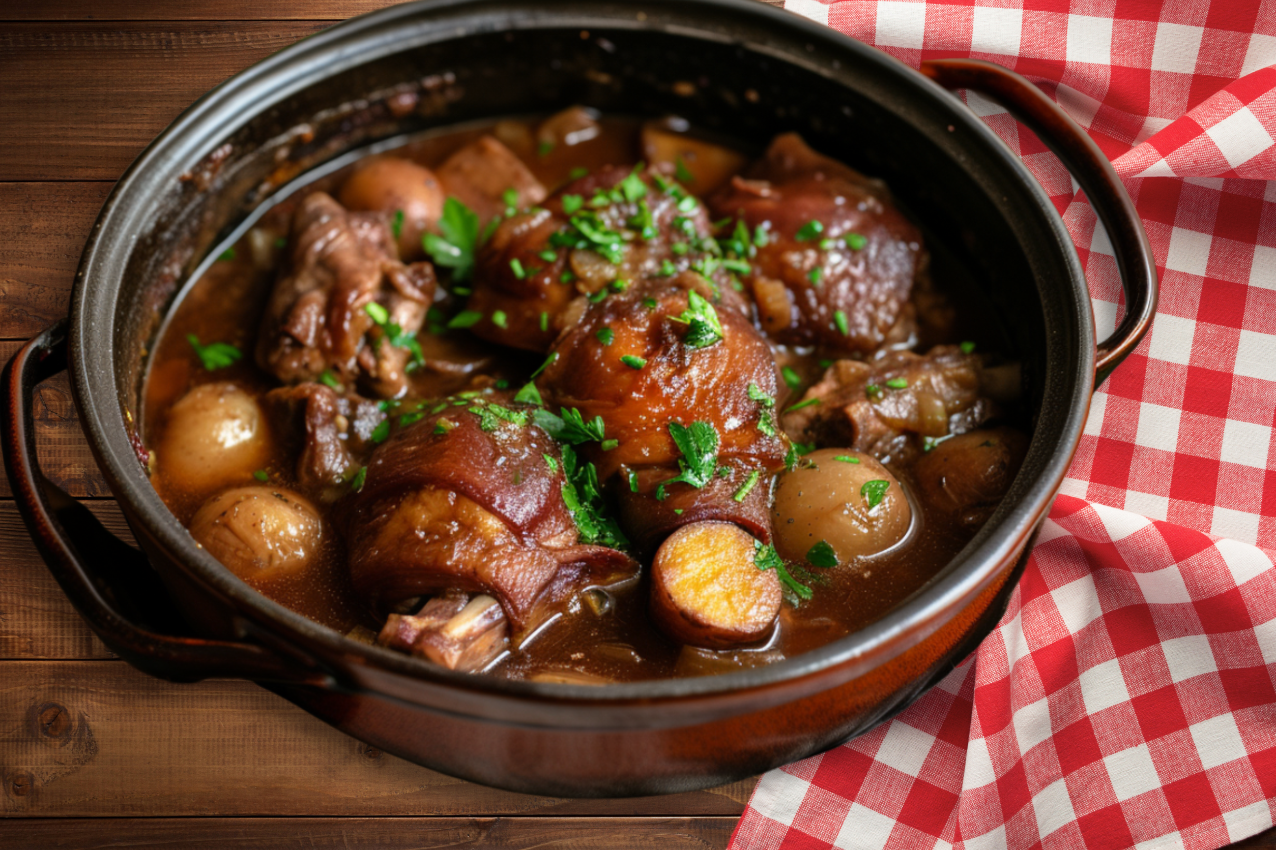 - Vuelve a colocar el pollo en la cazuela. Añade el vino tinto y el caldo de pollo hasta que el líquido cubra casi completamente el pollo. Agrega la salsa de tomate y las hierbas aromáticas y lleva a ebullición.